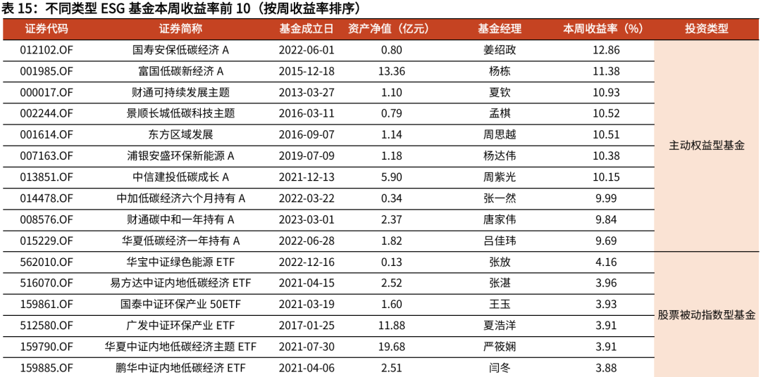 基金表现方面,主动权益型、股票被动指数型、债券型ESG基金本周净值涨跌幅中位数分别为4.50%、2.40%、-0.13 %。低碳经济、可持续发展、区域发展等主题基金表现明显占优。