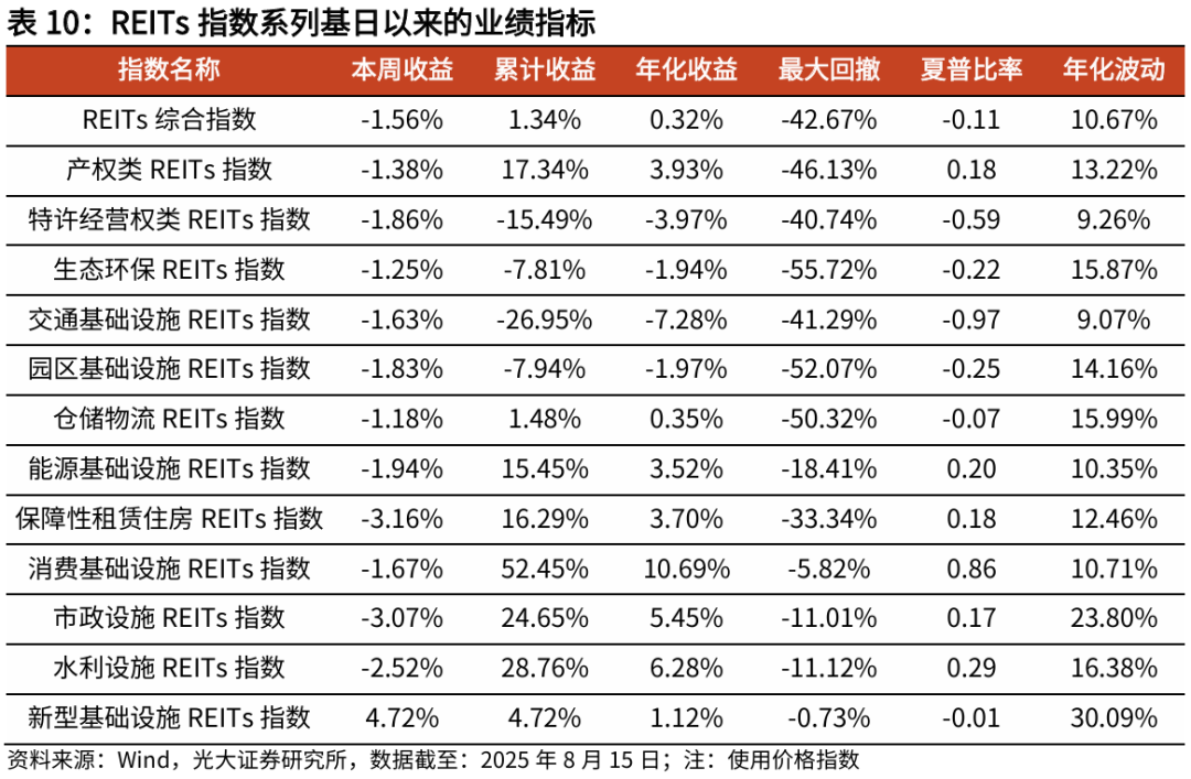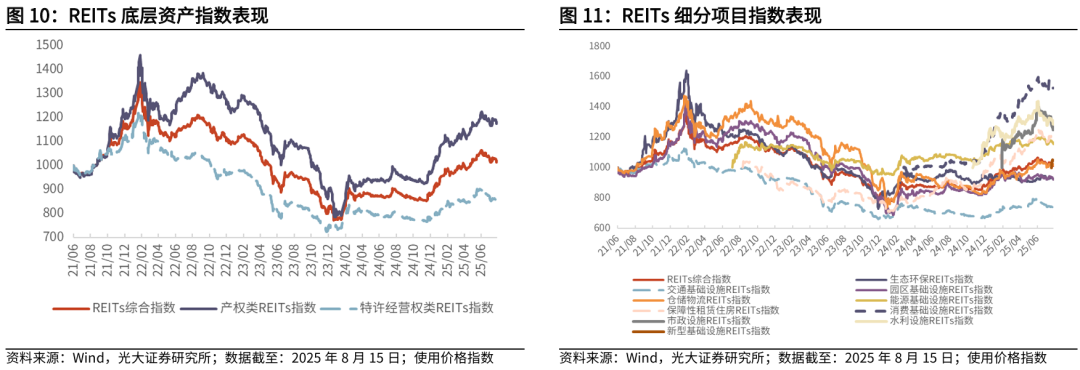 截至2025年8月15日,本周REITs市场震荡下行,REITs综合指数下跌1.56%。底层资产指数方面,产权类REITs指数下跌1.38%,特许经营权类REITs指数下跌1.86%。细分项目指数方面,新上市的新型基础设施REITs表现占优,新型基础设施REITs指数上涨4.72%。