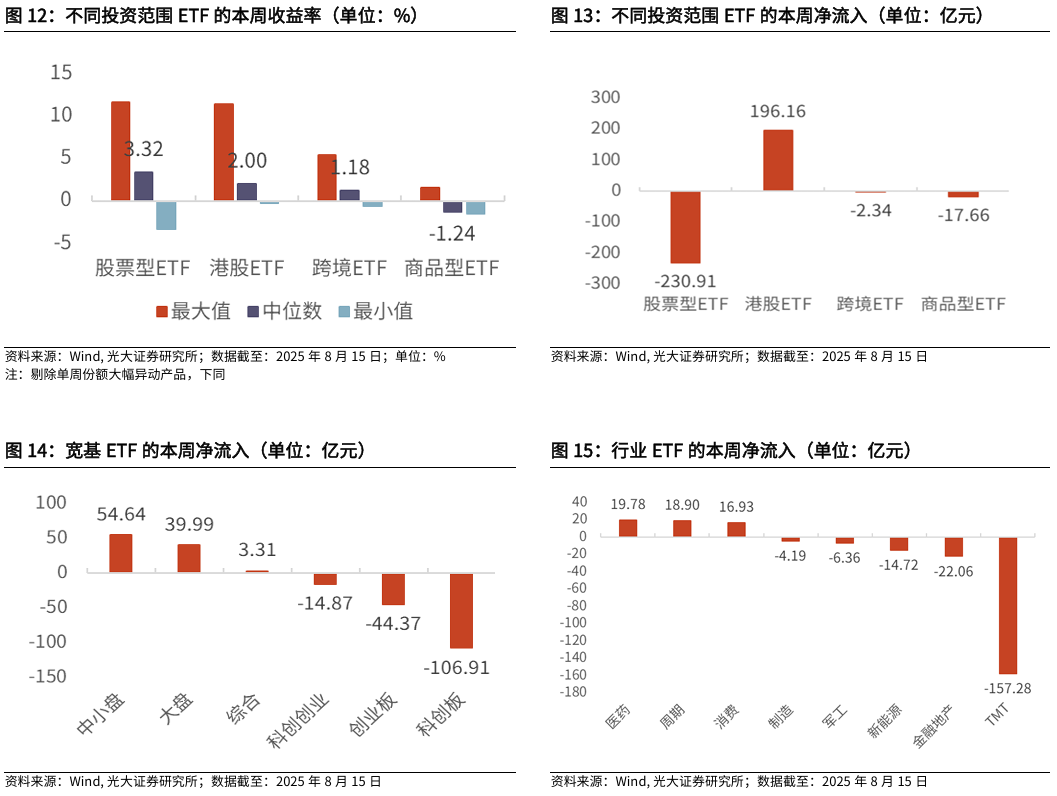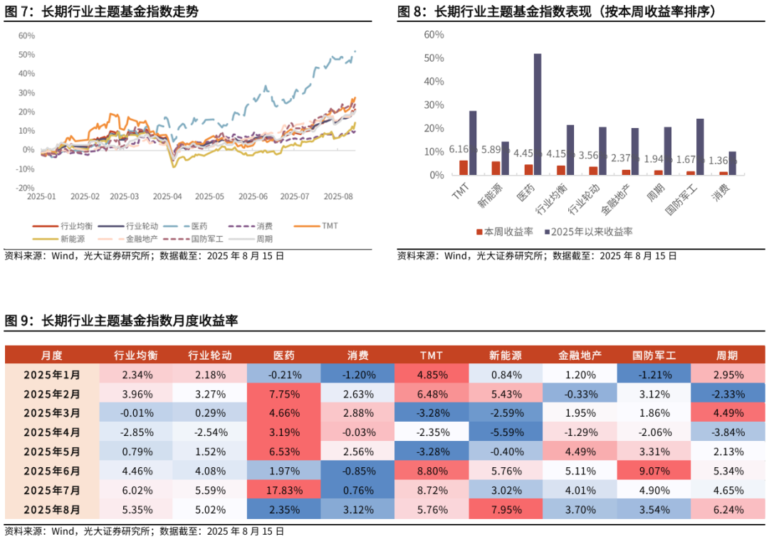 基金产品表现跟踪:行业主题基金方面,本周各主题基金均呈现上涨,TMT主题基金表现显著领先,消费主题基金涨势相对较弱。截至2025年8月15日,TMT、新能源、医药、行业均衡、行业轮动、金融地产、周期、国防军工、消费主题基金涨跌幅分别为6.16% 、5.89% 、4.45% 、4.15% 、3.56% 、2.37% 、1.94% 、1.67% 、1.36%。