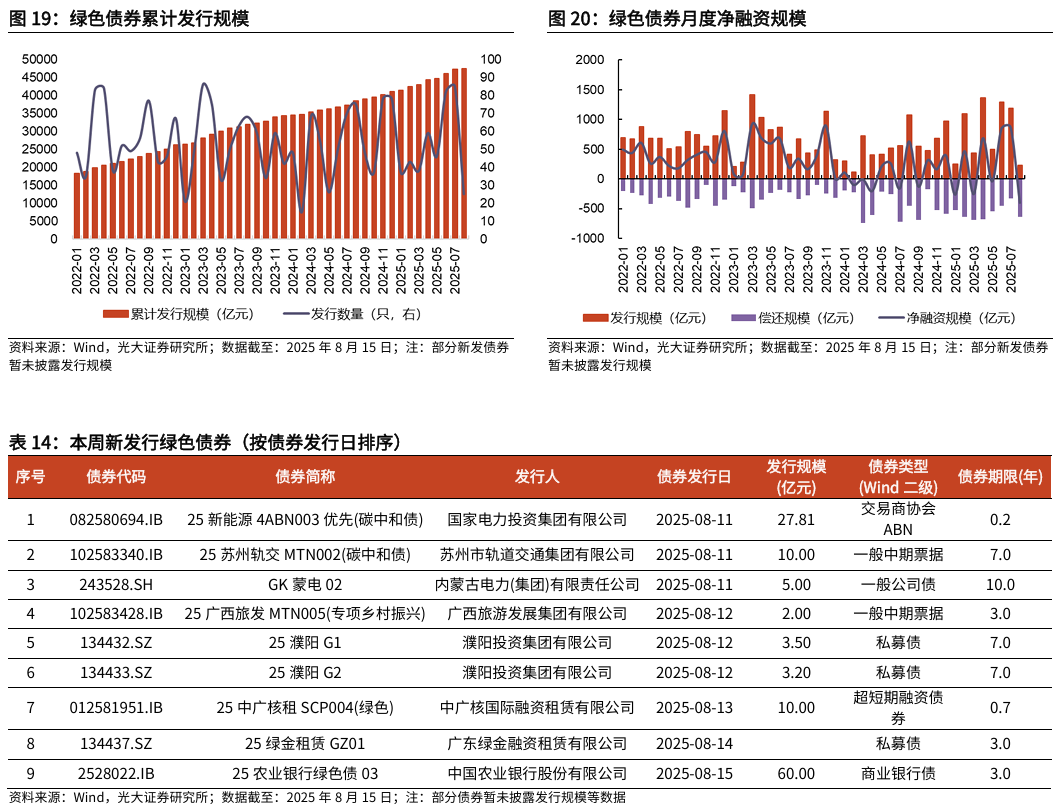 ESG金融产品跟踪:本周新发行绿色债券9只,已发行规模合计121.51亿元。国内绿色债券市场稳步发展,截至2025年8月15日,绿色债券市场累计发行规模合计4.74万亿元,发行数量合计4053只。