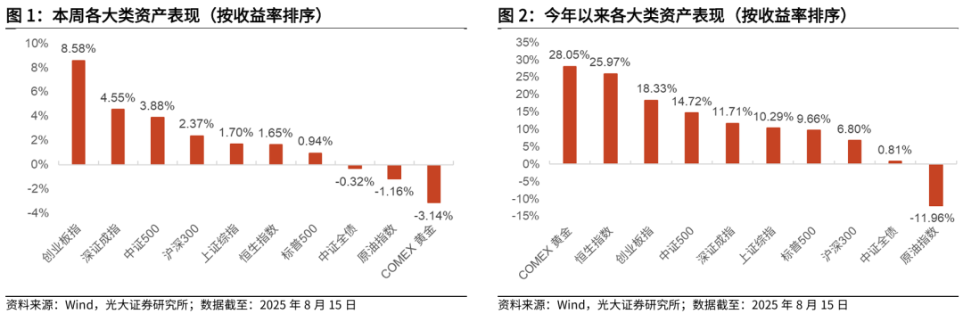 大类资产方面,本周(下文如无特殊说明,本周均指代2025.8.11-2025.8.15)国内权益市场涨势延续,创业板指上涨8.58%,黄金价格下跌。具体来看,创业板指上涨8.58%、深证成指上涨4.55%、中证500上涨3.88%、沪深300上涨2.37%、上证综指上涨1.70%、恒生指数上涨1.65%、标普500上涨0.94%、中证全债下跌0.32%、原油指数下跌1.16%、COMEX黄金下跌3.14%。