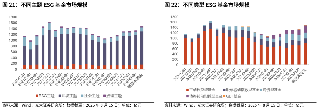 截至2025年8月15日,国内基金市场存量ESG基金共213只,规模合计1474.57亿元。分不同主题来看,ESG基金以环境主题基金为主,ESG主题、环境主题、社会主题、治理主题基金规模分别合计173.05、1140.33、137.52、23.68亿元。分不同类型来看,债券型基金在ESG基金中的占比逐渐提升,主动权益型、股票被动指数型、纯债型、债券被动指数型、QDII型ESG基金规模分别合计814.72、182.65、222.14、249.26、5.80亿元。