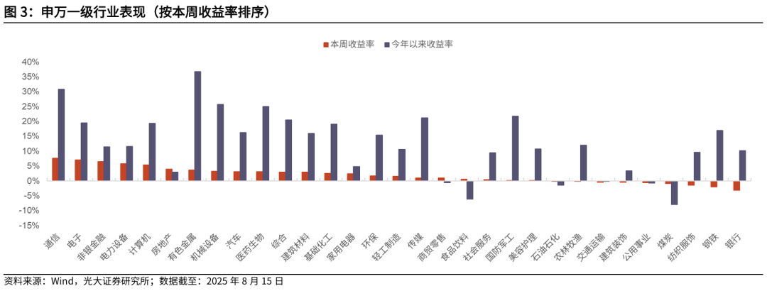 ]article_adlist-->摘要 ]article_adlist-->市场表现综述:大类资产方面,本周(下文如无特殊说明,本周均指代2025.8.11-2025.8.15)国内权益市场涨势延续,创业板指上涨8.58%,黄金价格下跌。行业方面,本周各申万一级行业多数上涨,通信、电子、非银金融行业涨幅居前,银行、钢铁、纺织服饰行业跌幅居前。基金市场方面,本周权益、债券型基金表现分化,偏股混合型基金领涨,纯债型基金小幅调整。