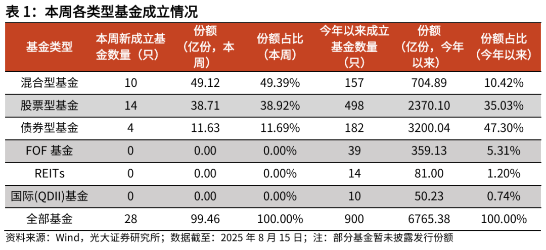 本周国内新基市场热度回落,新成立基金28只,合计发行份额为99.46亿份。其中混合型基金10只、股票型基金14只、债券型基金4只。本周新成立基金发行份额最大的是易方达价值回报(025057.OF),发行份额为23.43亿份,易方达价值回报为混合型基金。